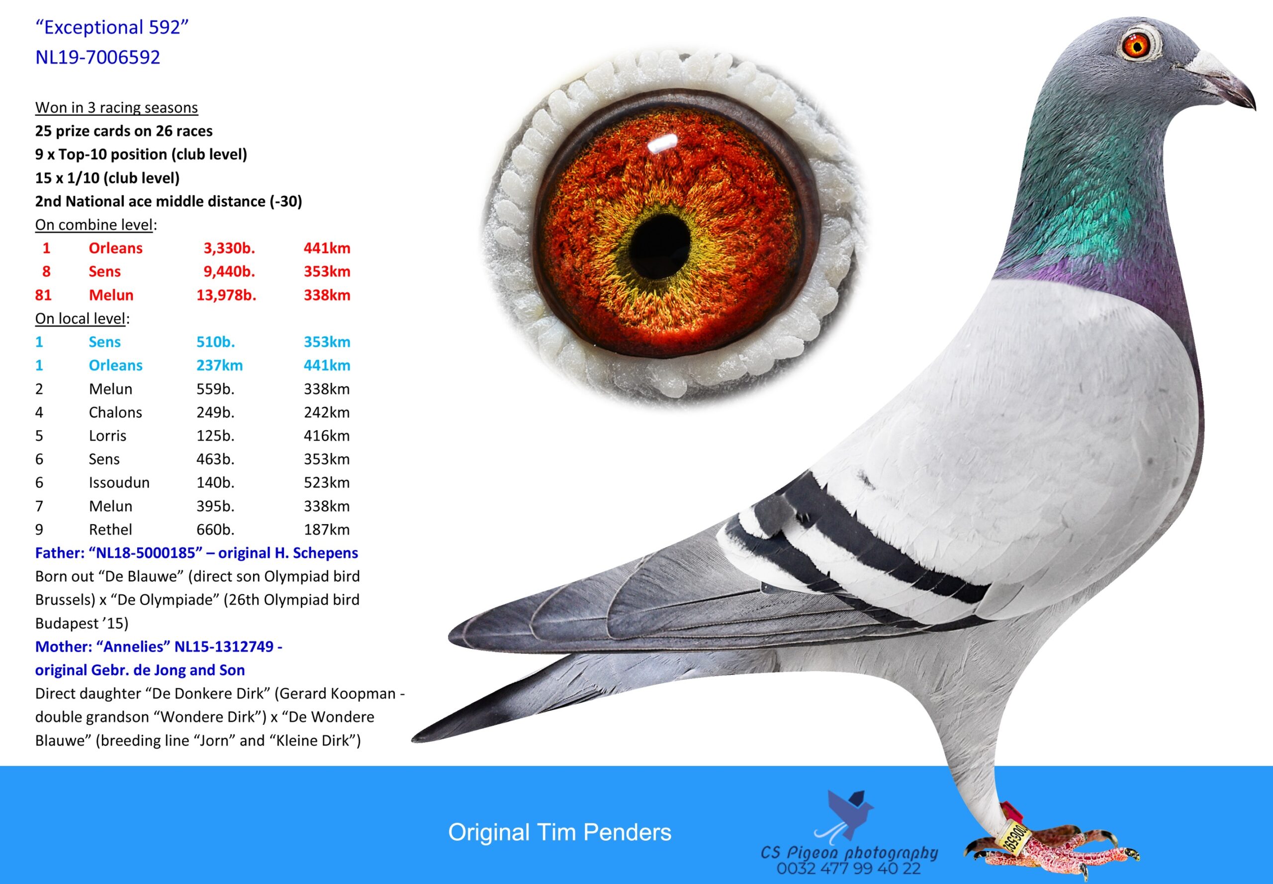 Uit: ”De 547”, zoon ”De 592”, 1. NPO Orleans 3.330 d., zoon ”De 041”, (Gr)vader 1. Nat. Issoudun 3.255 d. x ”De 798”, 1. Nat. Argenton 3.705 d., 1. NPO Argenton 1.390 d., 76. NPO Arcis 6.713 d., zus 2. NPO Issoudun 4.454 d.