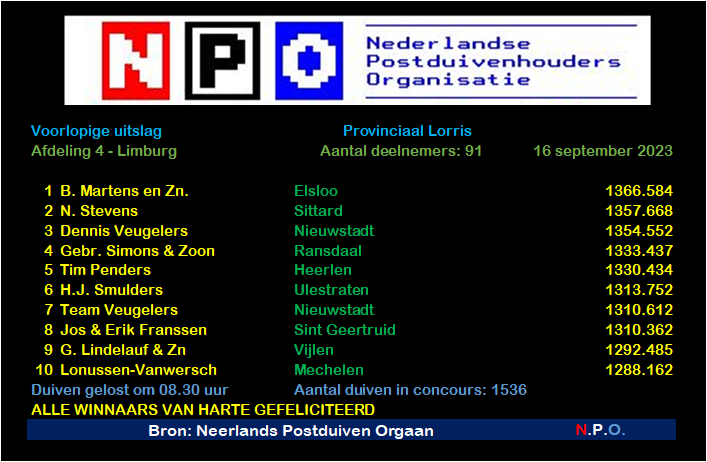 ”De 460”, 2. Prijs Issoudun, 66. NPO Issoudun 1.205 d., 132. NPO Issoudun 1.330 d., uit: ”De 730”, broer 1. Nat. Argenton 3.705 d. x ”Miss Iga”, 1. Lorris 452 d., 1. Sens 287 d., 5. Nat. Lorris 4.157 d., 5. NPO Lorris 1.536 d., 5. Marche 854
