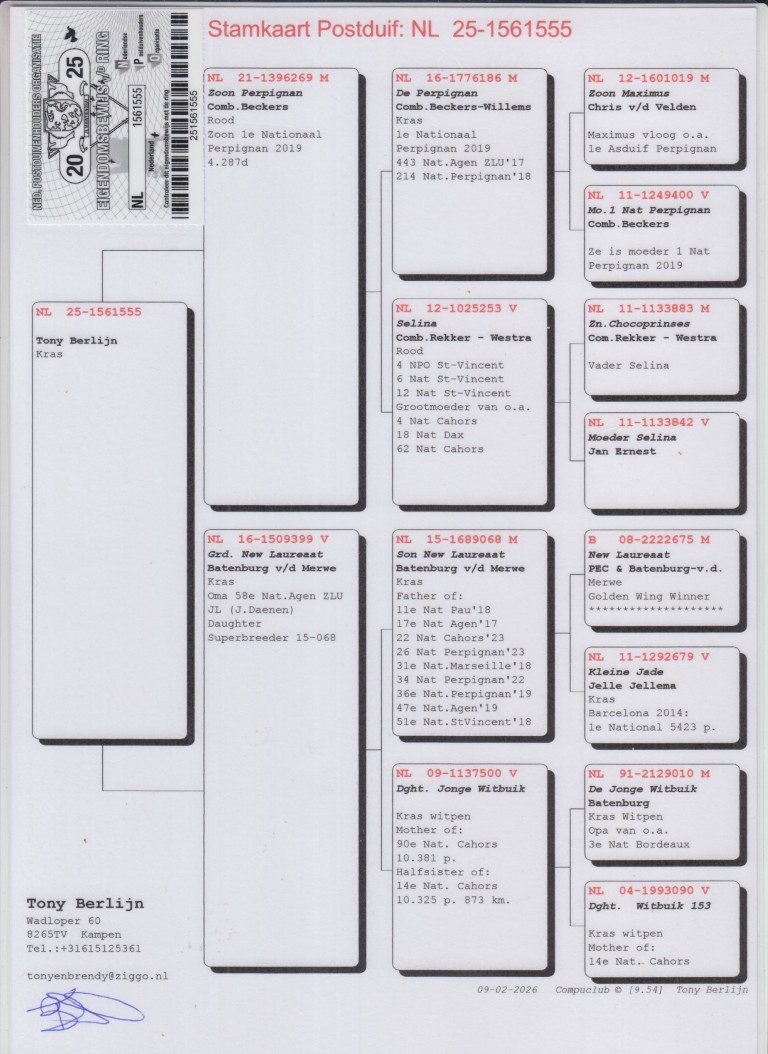 Uit: ”Zoon Perpignan”, zoon ”De Perpignan”, 1. Nat. Perpignan 4.287 d. & ”Selina”, 6. Nat. St.Vincent, 12. Nat. St.Vincent x ”Grd. New Laureaat”, gr-moeder 58. Nat. Agen, uit zoon ”New Laureaat” & ”Kleine Jade”