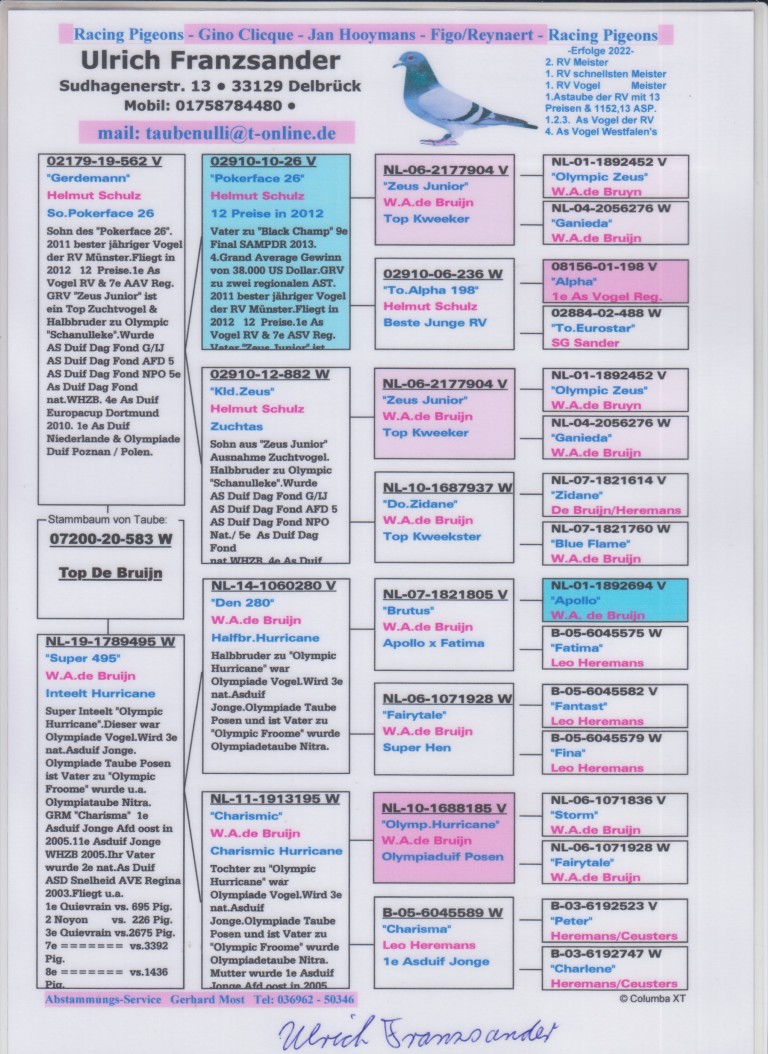 Uit: ”Gerdemann”, zoon ”Pokerface 26”, vader 4. Grand Average & 9. Finale OLR SAMPDR, uit zoon & dochter ”Zeus Junior”, W.A. de Bruijn x ”Super 495”, W.A. de Bruijn, uit 1/2 broer & dochter ”Olympic Hurricane”