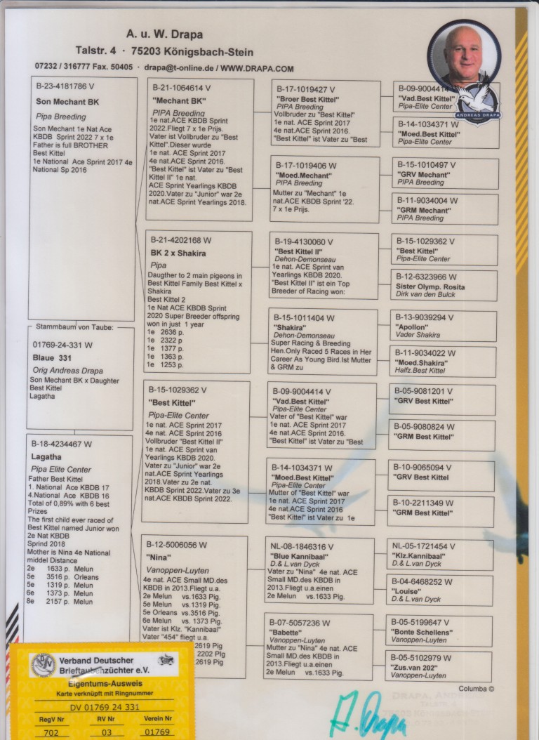Uit: ”Son Méchant BK”, zoon ”Méchant Best Kittel”, 1. Nat. Asduif Sprint KBDB & gr-vader 1. Extra Finale OLR PIPR Pattaya x ”Lagatha”, dochter ”Best Kittel”, 1. & 4. Nat. Asduif Sprint KBDB & Unieke stamvader PIPA Breeding