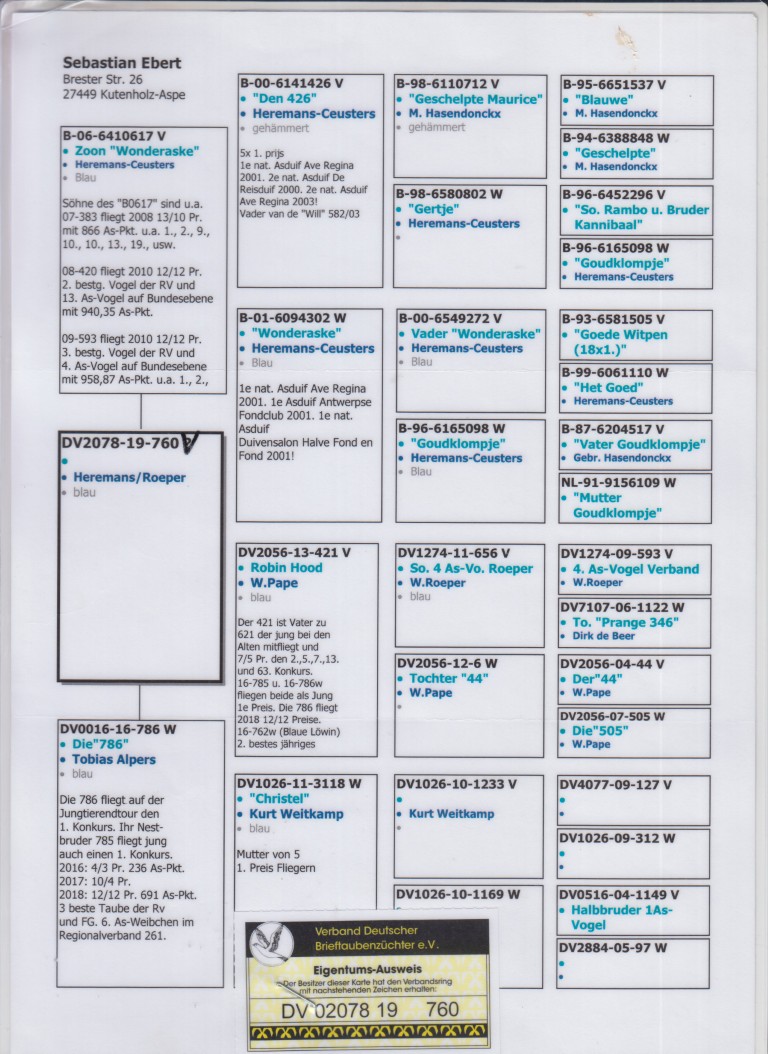 Uit: ”Zoon Wonderaske”, Heremans-Ceusters, vader 2. Olympiade duif Cat. Jaarlingen, 8. Nat. Asduif Doffers, zoon ”Wonderaske”, 1. Nat. Asduif Ave Regina 2001 x ”Die 786”, Tobias Alpers, 1. Prijs Winnaar, 3. Asduif Jonge Duiven
