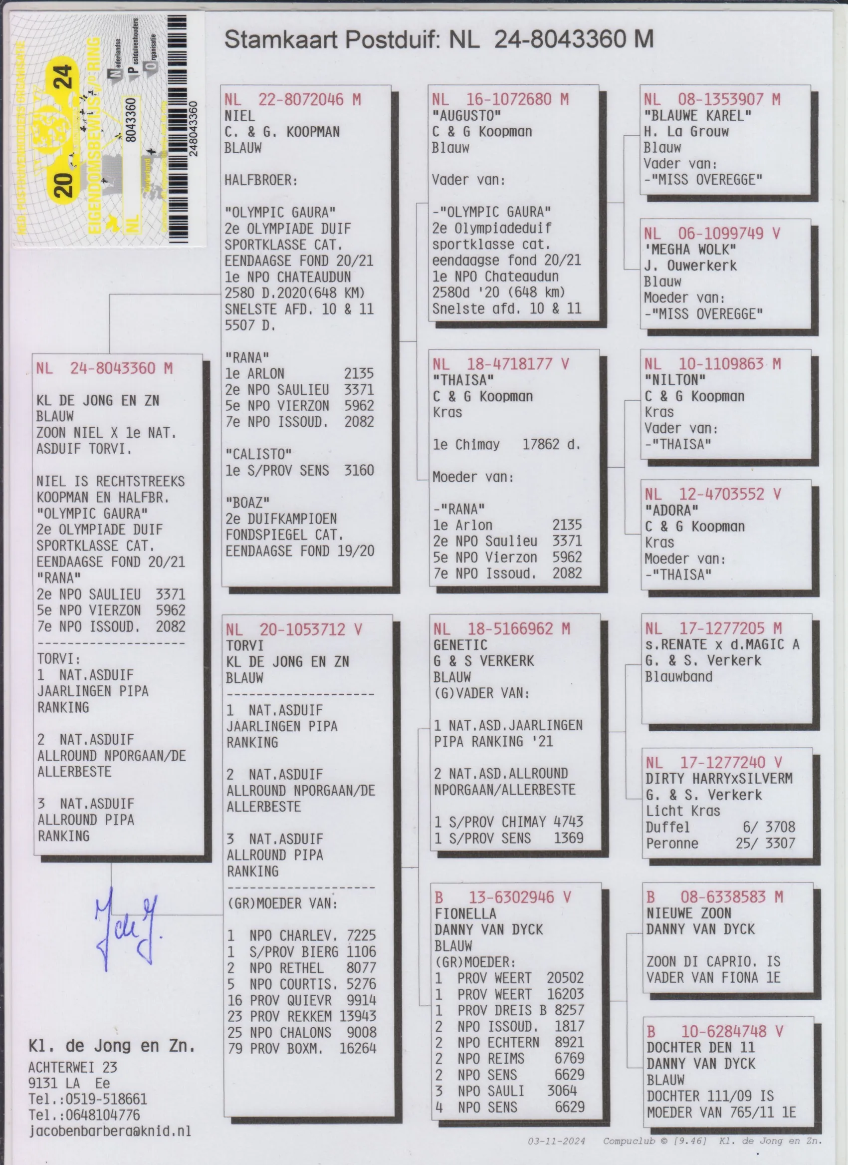 Uit: ”Niel”, 1/2 broer ”Olympic Gaura”, 2. Olympiade Cat. Dagfond x ”Torvi”, 1. Nat. Asduif Jaarlingen, 2. Nat. Asduif Allround, 3. Nat. Asduif Allround PIPA, (Gr) moeder 1. NPO 7.225 d., 1.-1.106 d., 2. NPO 8.077 d., 5. NPO 5.276 d.