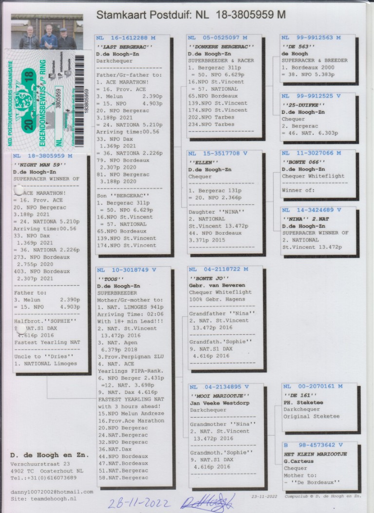 Winnaar van: 1. Asduif Marathon, 24. Nat. Bergerac 5.210 d. (Geklokt 00.56), 36. Nat. Dax 2.226 d., vader 3. Melun 2.390 d., uit: ”Last Bergerac” x ”Toos”, moeder & gr-moeder 1. Nat. Limoges, 2. Nat. St.Vincent, 3. Nat. Agen