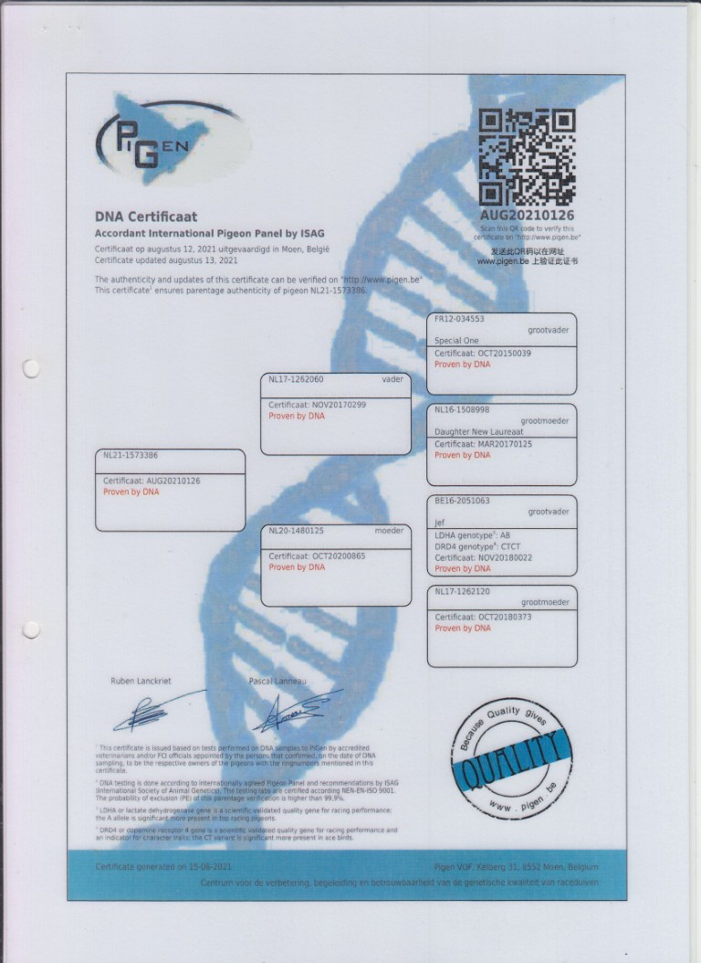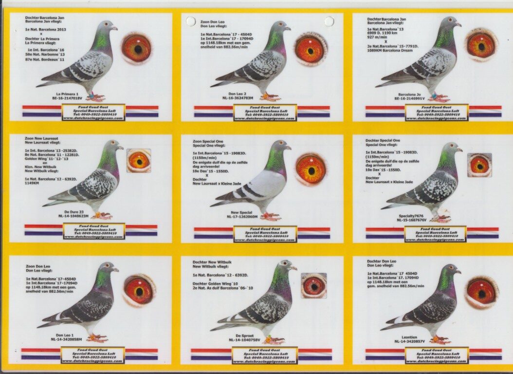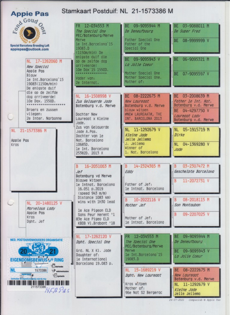 Uit: ”New Special”, zoon ”The Special One”, 1. Int. Barcelona 19.083 d. (Enige duif thuis op de dag van lossing), uit dochter ”New Laureaat” & ”Kleine Jade” x ”Marvelous Lady”, dochter ”Jef”, 1. Int. Barcelona 16.051 d.