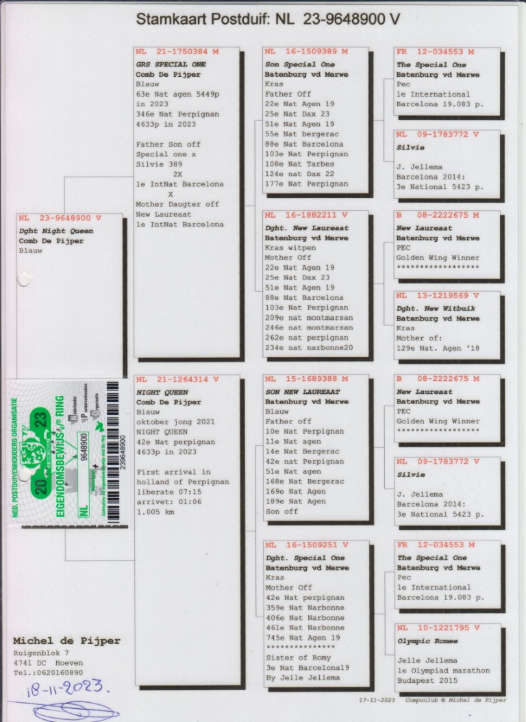 Uit: ”Grs. Special One”, 63. Nat. Agen, uit zoon ”Special One” & ”Silvie”, uit dochter ”New Laureaat” x ”Night Queen”, 42. Nat. Perpignan 4.633 d. (Geklokt 01.06), uit zoon ”New Laureaat” & ”Silvie”, uit dtr. ”Romee”