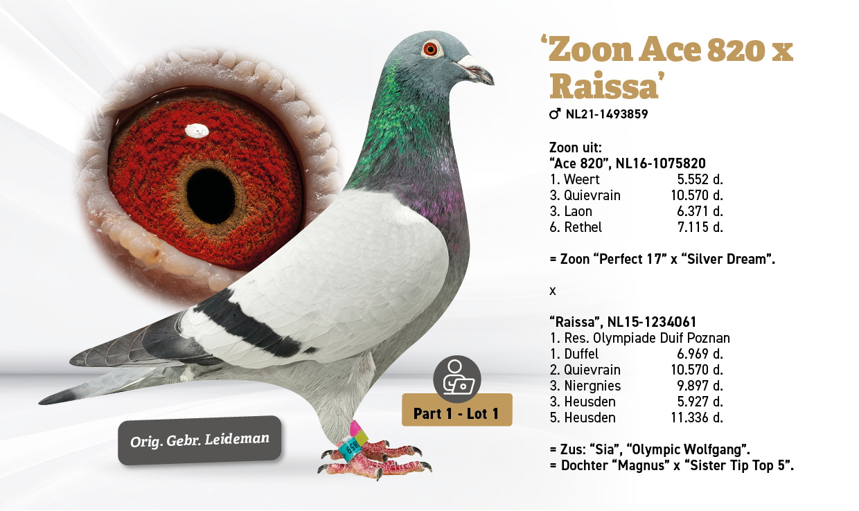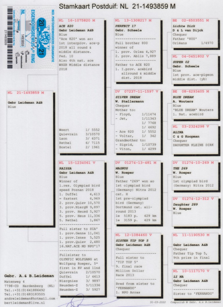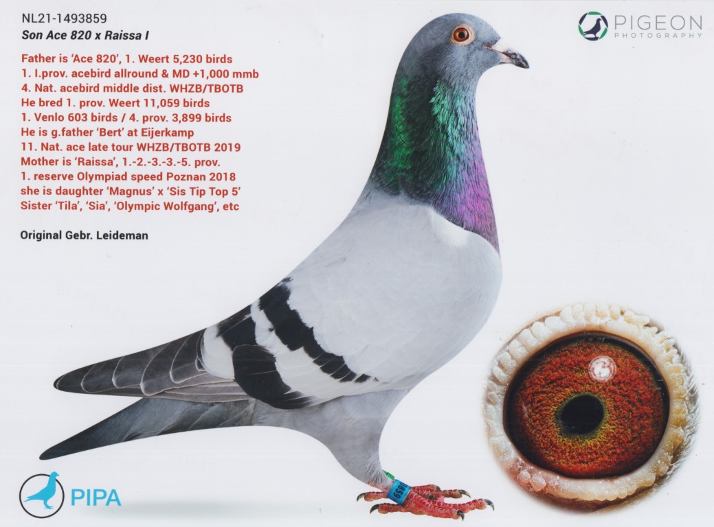 Uit: ”Ace 820”, 1. Inter-Prov. Asduif Allround, 4. Nat. Asduif, vader ”Grizzle Mama” & gr-vader ”Grizzle Best Kittel” x ”Raissa”, Reserve Olympiade duif, 1.-6.969 d., 2.-10.570 d., 3.-9.897 d.