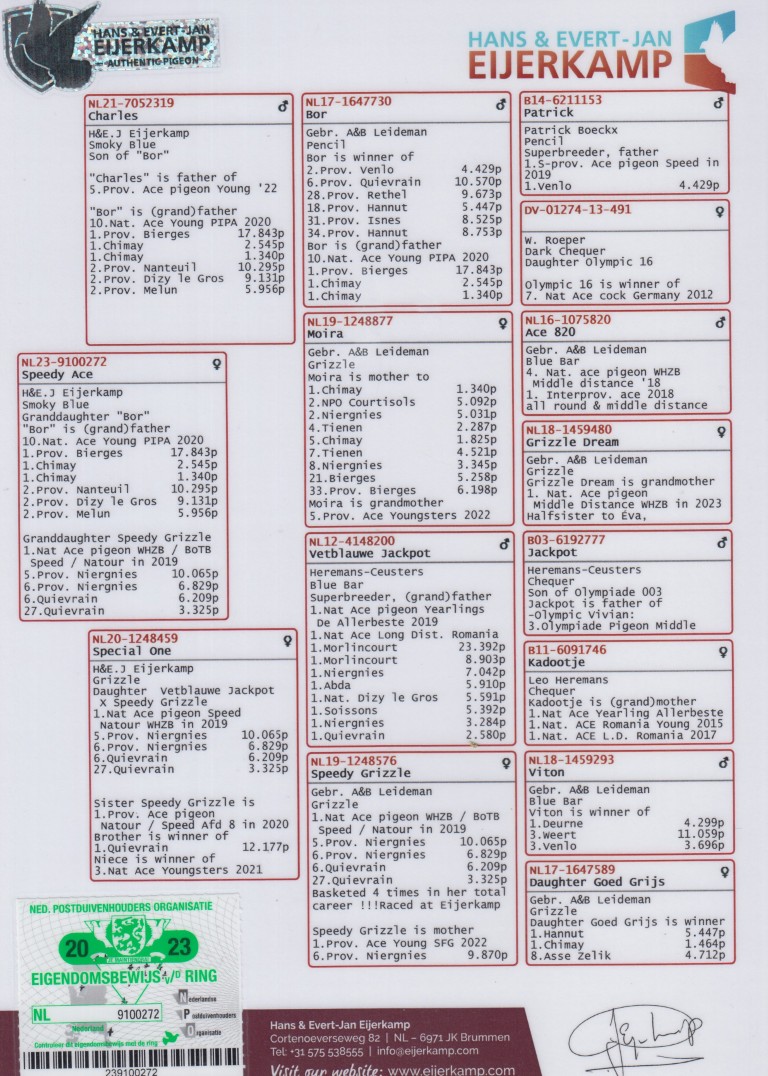Uit: ”Charles”, vader 5. Prov. Asduif Jonge Duiven, zoon Superkweker ”Bor” x ”Special One”, dochter ”Vetblauwe Jackpot” & ”Speedy Grizzle”, 1. Nat. Asduif Sprint WHZB & dochter ”Viton” & ”Dtr. Goed Grijs”