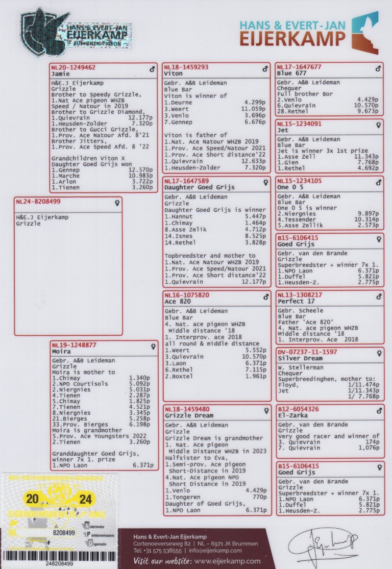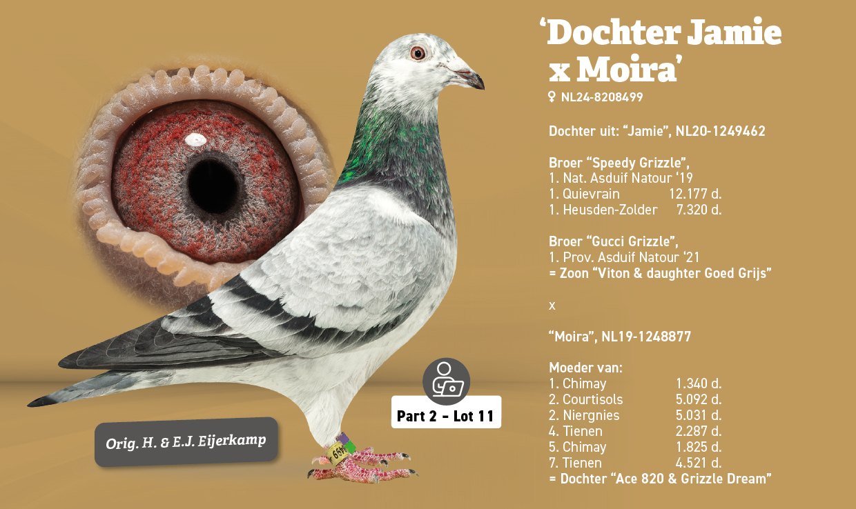 Uit: ”Jamie”, broer ”Speedy Grizzle”, 1. Nat. Asduif Sprint WHZB, zoon ”Viton” & ”Dtr. Goed Grijs” x ”Moira”, moeder 1.-1.340 d., 2. NPO 5.092 d., 2.-5.031 d., 4.-2.287 d., 5.-1.825 d., dochter ”Ace 820” & ”Grizzle Dream”