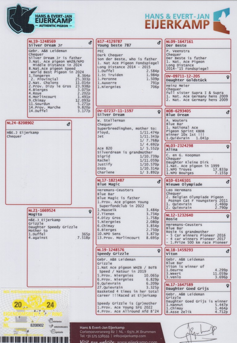 Uit: ”Silver Dream Jr.”, vader ”Olympic Amber”, 3. Olympiade Cat. Midfond, 3. Nat. Asduif Midfond, 1.-2.-2.-4.-4.-4.-etc. tegen gemiddeld 10.000 d. x ”Mogito”, moeder 4. Duffel 7.518 d., dochter ”Speedy Grizzle”, 1. Nat. Asduif