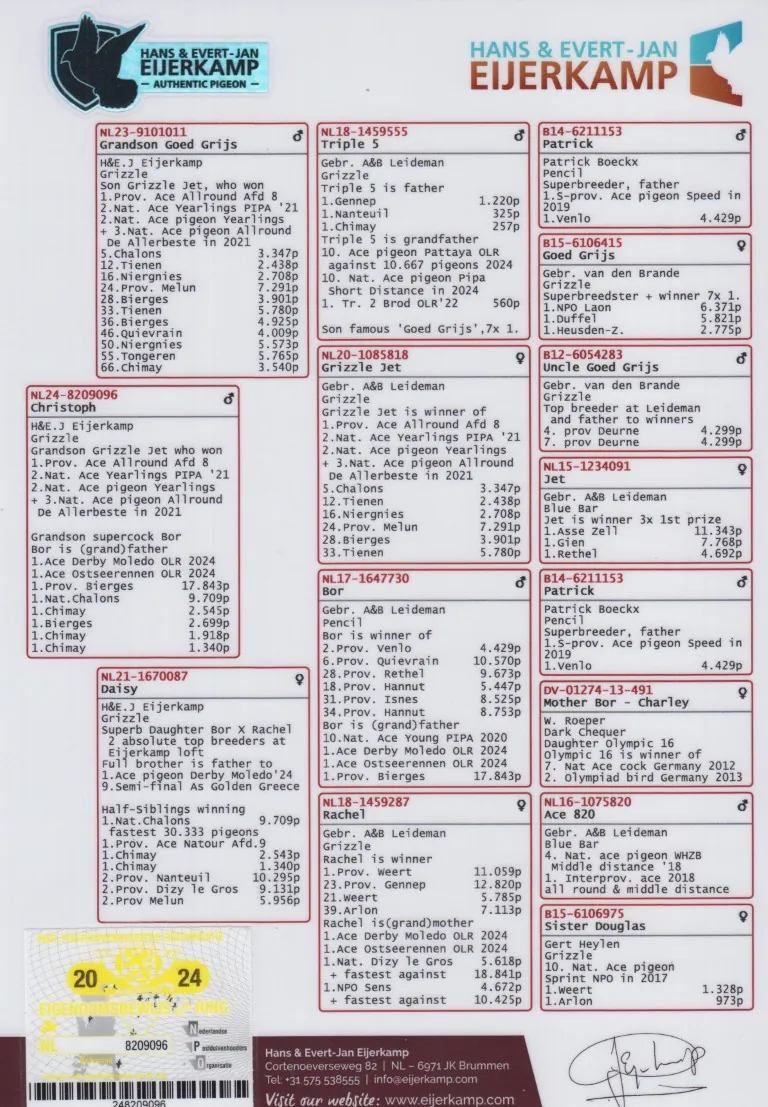 Uit: ”Grs. Goed Grijs”, uit zoon ”Goed Grijs” & broer ”Eva”, zoon ”Grizzle Jet”, 1. Prov. Asduif Allround, 2.-2.-3. Nat. Asduif x ”Daisy”, dochter ”Bor”, Unieke kweker & 2. Prov. 4.429 d., dochter ”Rachel”, 1. Prov. 11.059 d.