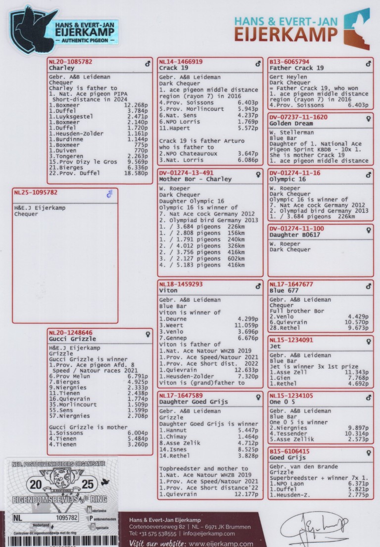 Uit: ”Charley”, vader 1. Nat. Asduif Sprint PIPA-Rankings, 1.-12.268 d., 1.-3.784 d., 1.-2.471 d., 1.-2.140 d., zoon ”Crack 19”, Unieke Stamvader x ”Gucci Grizzle”, 1. Prov. Asduif Sprint, uit dochter ”Goed Grijs”, 7x 1. Prijs