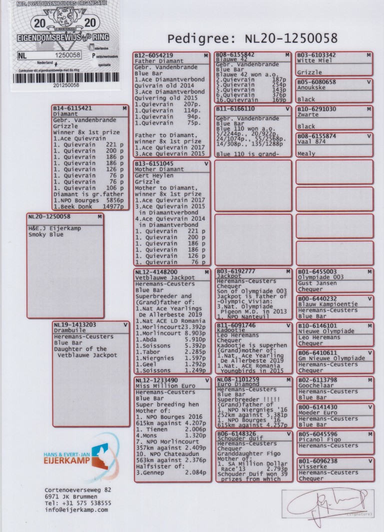 Uit: ”Diamant”, 8x 1. Prijs Quiévrain, nazaten: 1. Prov. 16.000 d., 1.-14.977 d., 1.-5.983 d., 1.-5.856 d., 1.-5.031 d., 1.-2.710 d. x ”Drambuile”, dochter ”Vetblauwe Jackpot”, Superkweker