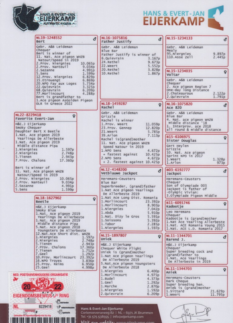 Uit: ”Bert”, 11. Nat. Asduif, 2. Prov. 10.065 d., 2. Prov. 9.034 d., zoon ”Rachel”, 1. Prov. 11.059 d. x ”Beetle”, 2x 1. Nat. Asduif, 1.-1.597 d., 2.-2.748 d., 5.-2.943 d., 7. Prov. 17.360 d., dochter ”Vetblauwe Jackpot” & ”Uniek”