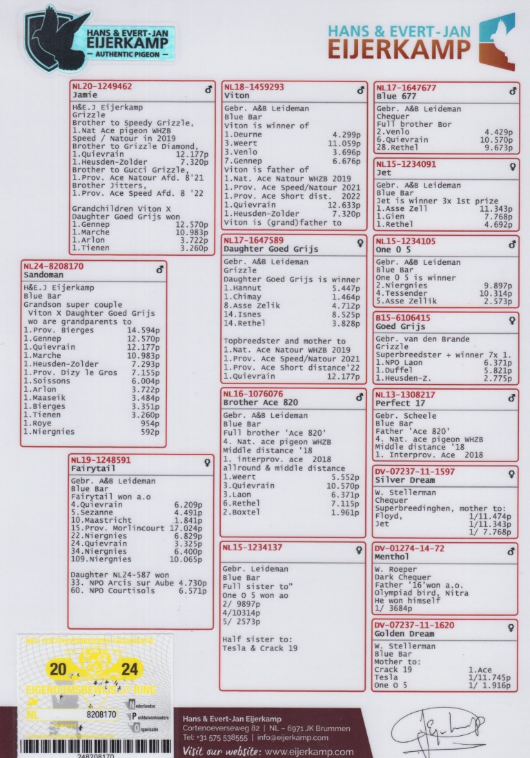 Uit: ”Jamie”, broer ”Speedy Grizzle”, 1. Nat. Asduif Sprint WHZB, zoon ”Viton” & ”Dtr. Goed Grijs” x ”Fairytail”, 4.-6.209 d., 5.-4.491 d., 10.-1.841 d., 15. Prov. 17.024 d., 22.-6.829 d., 24.-3.325 d., uit broer ”Ace 820”