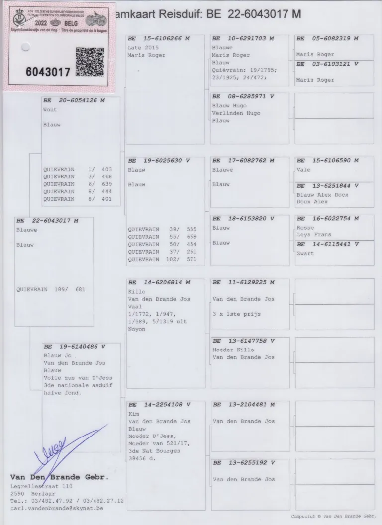 Uit: ”Wout”, 1.-403 d., 3.-468 d., 6.-639 d., 8.-444 d., 8.-401 d. x ”Blauw Jo”, zus ”Jess”, 3. Nat. Asduif Kleine Halve Fond KBDB, 1/2 zus 3. Nat. Bourges 38.456 d., dochter ”Killo”, 1.-1.772 d., 1.-947 d., 1.-589 d., 5.-1.319 d.