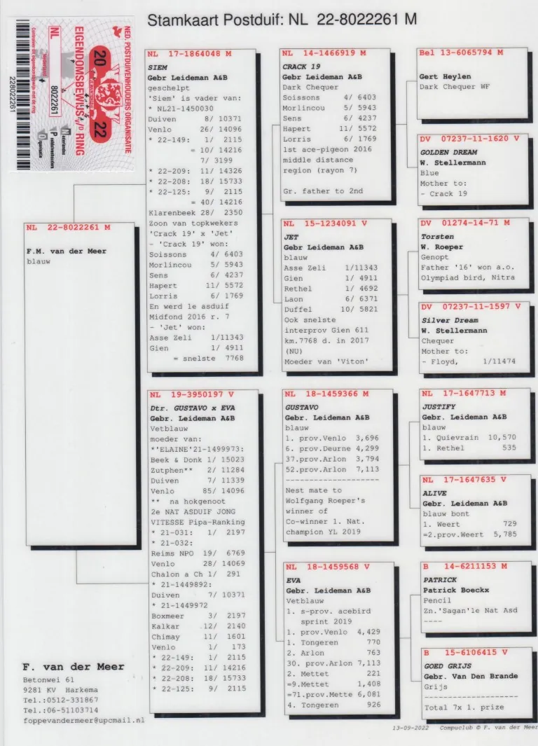 Uit: ”Siem”, vader 1.-2.115 d., zoon ”Crack 19” & ”Jet” x ”Eva-Lotta”, moeder 1.-15.078 d., 1.-2.197 d., 1.-2.115 d., 2. Nat. Asduif, gr-moeder 1. Olympiade duif, 1. Int. Asduif Midfond FCI, 1.-5.267 d., 1.-5.066 d., 1.-4.252 d.