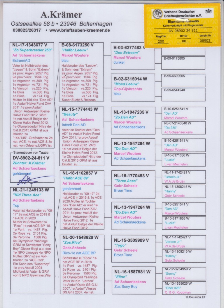 Uit: ”Zoon Superbreeder 250”, uit 1/2 broer ”De Leeuw” & zoon ”De Extreem”, uit dubbele kld. ”Den Ad”, 1. Nat. Asduif KBDB, 1. Olympiade duif x ”Kld. Three Ace”, uit zus ”Rico”, 1. Nat. Asduif, uit zoon ”Three Aces”