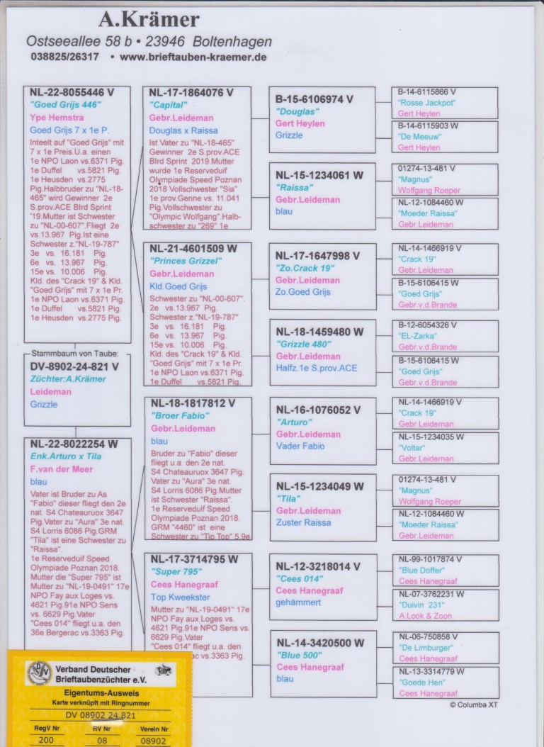 Uit: ”Goed Grijs 446”, inteelt ”Goed Grijs”, 7x 1. Prijs & 1. NPO Laon 6.371 d., nazaten winnen 6x 1. Nat. Asduif x ”Enk. Arturo & Tila”, uit broer ”Fabio”, vader 1. Nat. Vierzon & zoon ”Arturo” & ”Tila”, Stamkoppel Leideman