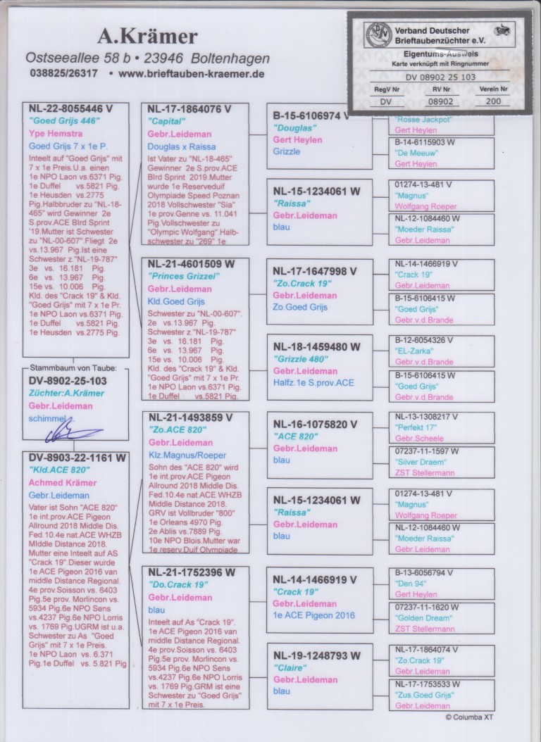 Uit: ”Goed Grijs 446”, uit dubbele kld. ”Goed Grijs”, 7x 1. Prijs & 1. NPO Laon 6.371 d., nazaten winnen 6x 1. Nat. Asduif x ”Kld. Ace 820”, uit 1/2 broer ”Grizzle Mama”, verkocht voor 282.000 euro, uit dochter ”Crack 19”
