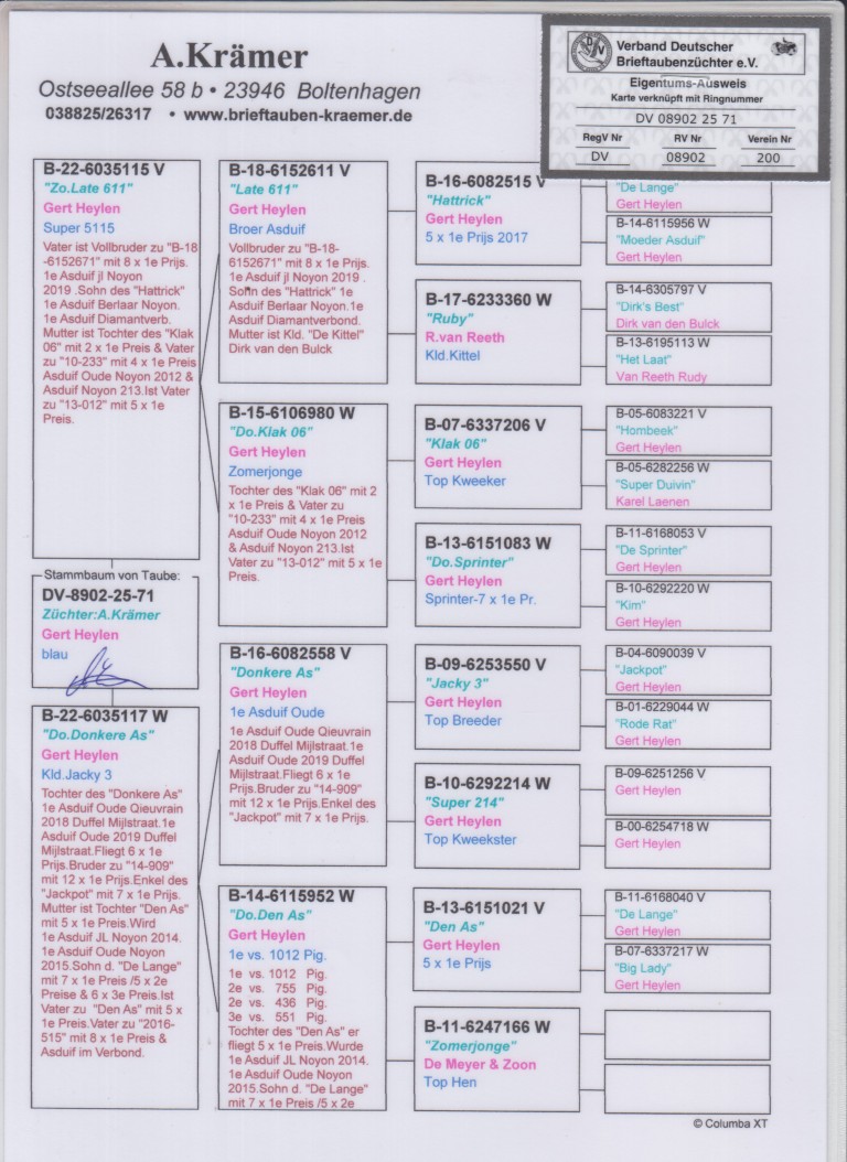 Uit: ”Zoon Late 611”, zoon ”Late 611”, broer 8x 1. Prijs & 1. Asduif Noyon, uit zoon ”Hattrick”, 5x 1. Prijs x ”Dochter Donkeren As”, dochter ”Donkeren As”, 1. Asduif Quiévrain, dochter 1.-1.012 d., uit dochter ”Den As”, 5x 1. Prijs