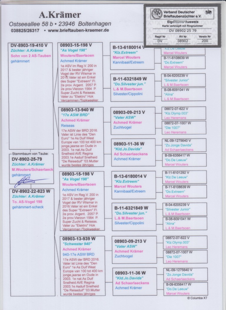 Uit: ”De 410”, zoon ”As Vogel 198”, 1. Regionaal Asduif, uit zoon ”De 940”, 17. Nat. Asduif Duitsland x ”De 823”, dochter ”As Vogel 198”, 1. Regionaal Asduif, lijn ”Extreem”, ”De Leeuw” & ”Den Ad”, 1. Nat. Asduif KBDB