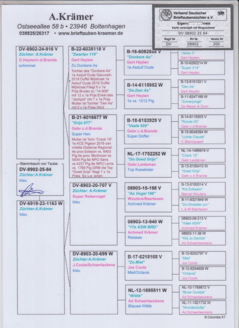 Grootvader: DV8903-20-707. A. Krämer. Super vliegduif.