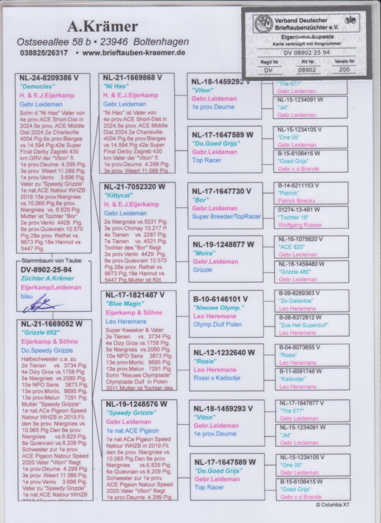 Uit: ”Damocles”, uit broer ”Speedy Grizzle”, 1. Nat. Asduif, zoon Superkoppel ”Viton” & ”Dtr. Goed Grijs” x ”Grizzle 052”, dochter ”Speedy Grizzle”, 1. Nat. Asduif Sprint WHZB & dochter ”Viton” & ”Dtr. Goed Grijs”