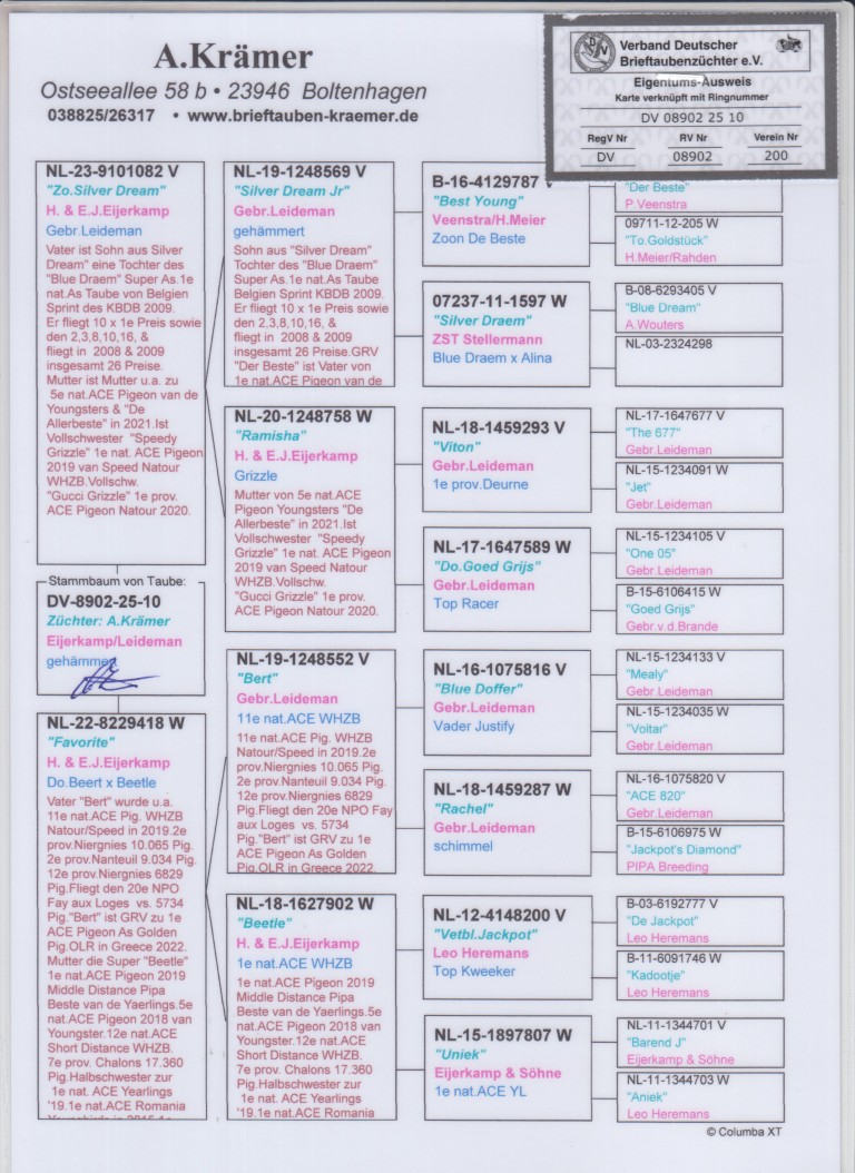 Uit: ”Zoon Silver Dream”, 1/2 broer ”Olympic Amber”, Olympiade duif 2026, uit dochter ”Viton” & ”Dtr. Goed Grijs” x ”Favorite”, dochter ”Bert”, 11. Nat. Asduif WHZB. dochter ”Beetle”, 1. Nat. Asduif Midfond WHZB