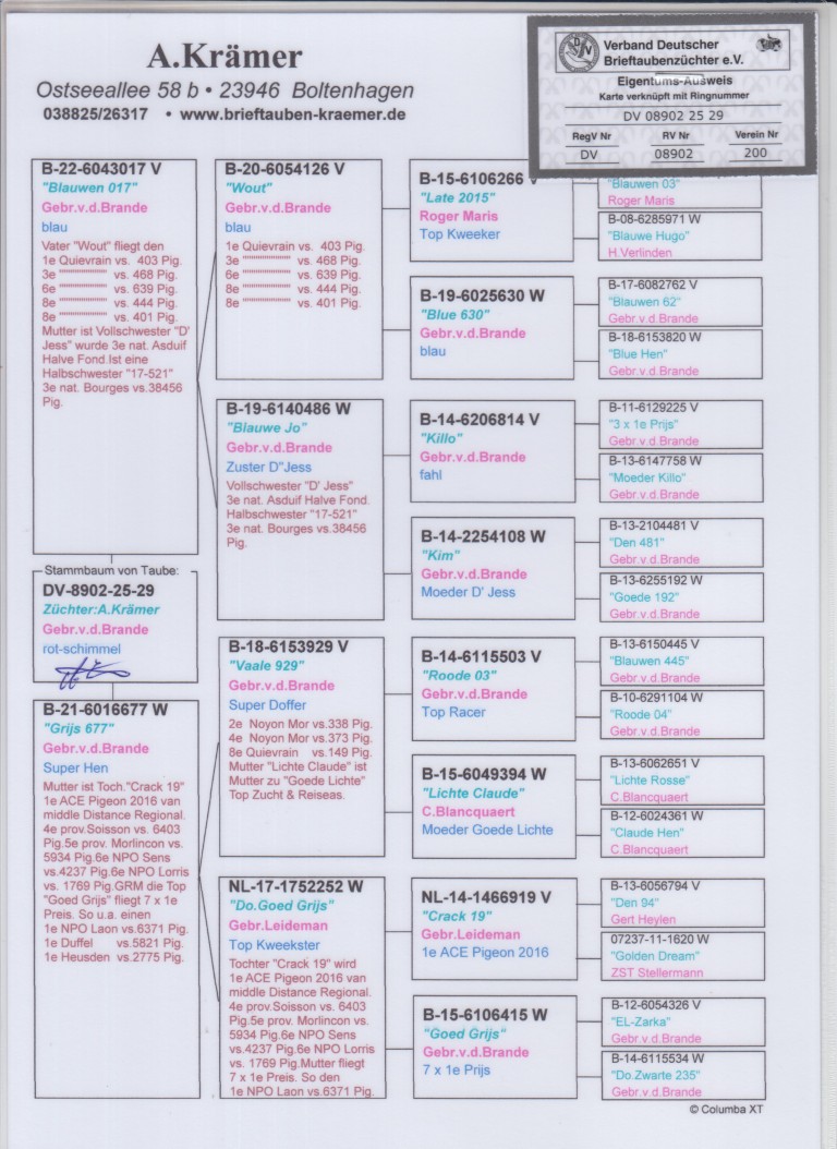 Moeder: B21-6016677. ‘Grijs 677’, Gebr. Van den Brande. Superduivin.