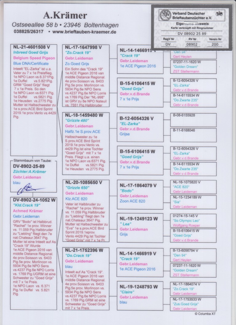Uit: ”Inbreed Goed Grijs”, uit zoon ”Crack 19” & ”Goed Grijs”, uit dochter ”El-Zarka” & ”Goed Grijs”, 7x 1. Prjs & 1. NPO Laon 6.371 d., nazaten winnen 6x 1. Nat. Asduif x ”Kld. Crack 19”, uit dochter ”Crack 19”, Superkweker