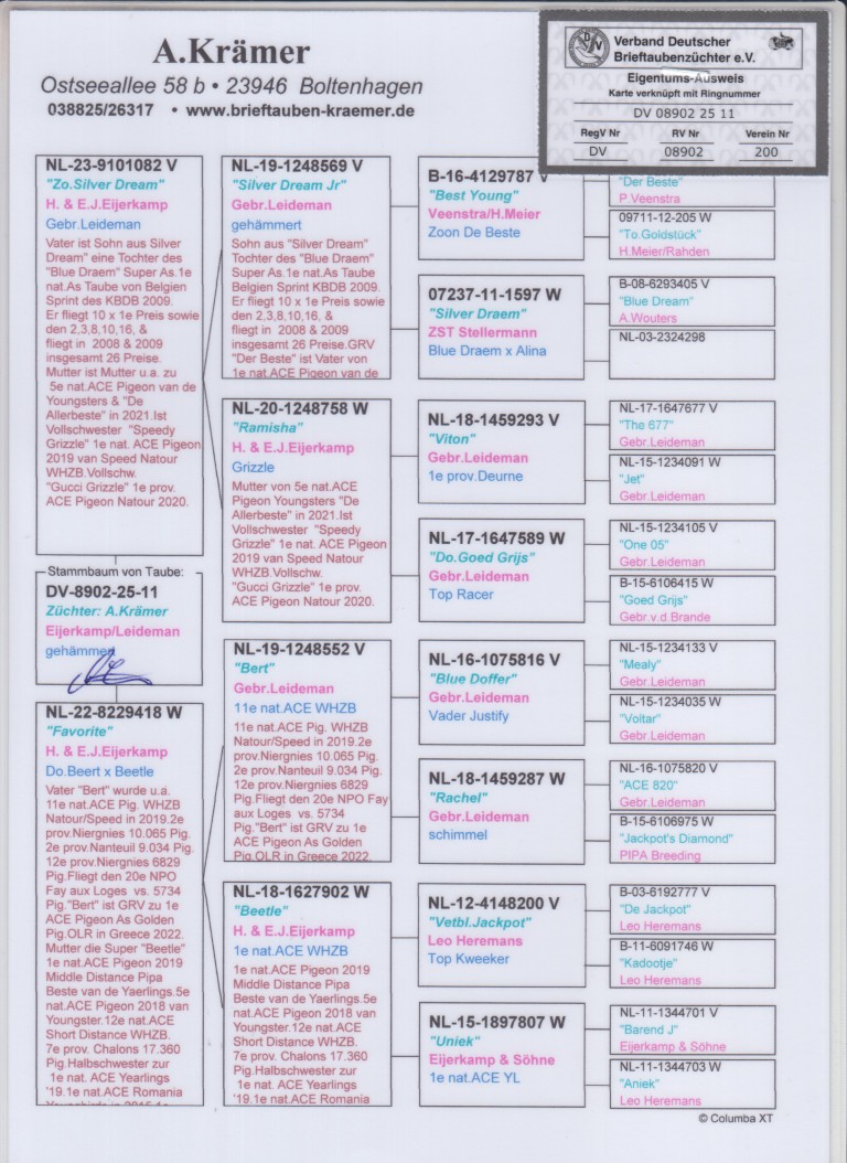 Uit: ”Zoon Silver Dream”, 1/2 broer ”Olympic Amber”, Olympiade duif 2026, uit dochter ”Viton” & ”Dtr. Goed Grijs” x ”Favorite”, dochter ”Bert”, 11. Nat. Asduif WHZB. dochter ”Beetle”, 1. Nat. Asduif Midfond WHZB