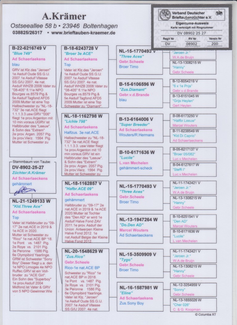 Uit: ”Blue 749”, uit zoon Superkweker ”Three Aces”, Nieuwe stamvader Schaerlaeckens x ”Kld. Three Aces”, uit zus ”Rico”, 1. Nat. Asduif Allround, uit zoon Superkweker ”Three Aces”, Nieuwe stamvader Schaerlaeckens
