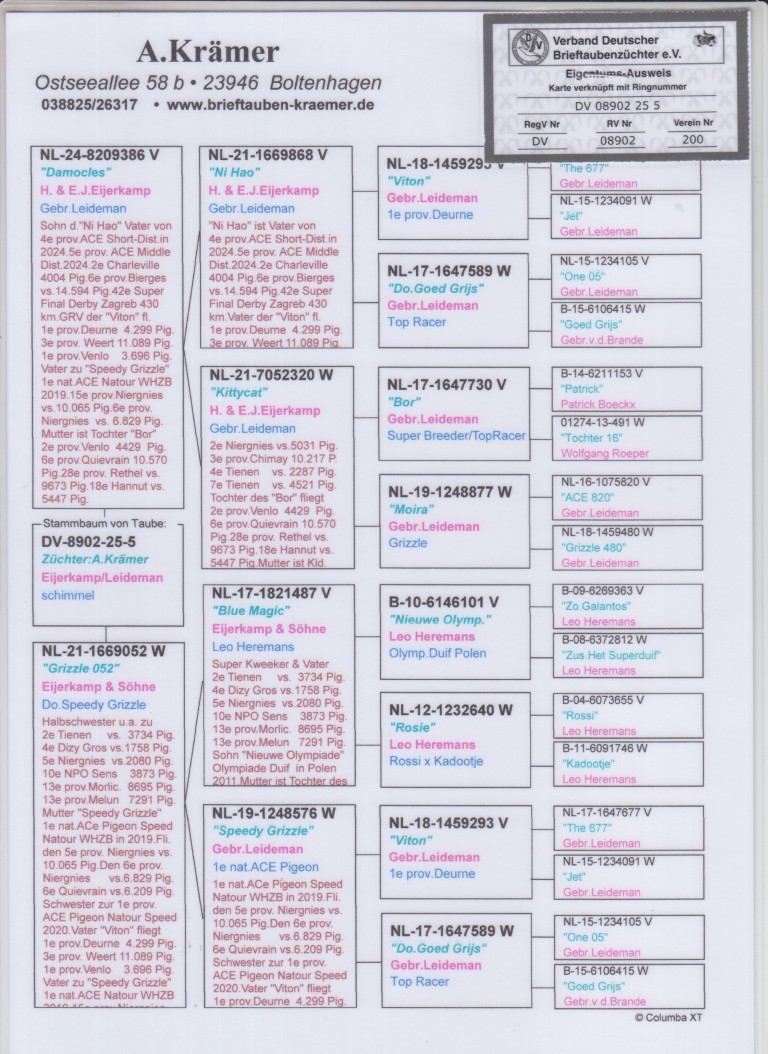 Uit: ”Damocles”, zoon topkwekers, zoon ”Viton” & ”Dtr. Goed Grijs”, ouders ”Speedy Grizzle”, 1. Nat. Asduif WHZB x ”Grizzle 052”, dochter ”Speedy Grizzle”, 1. Nat. Asduif Sprint WHZB & dtr. ”Viton” & ”Dtr. Goed Grijs”