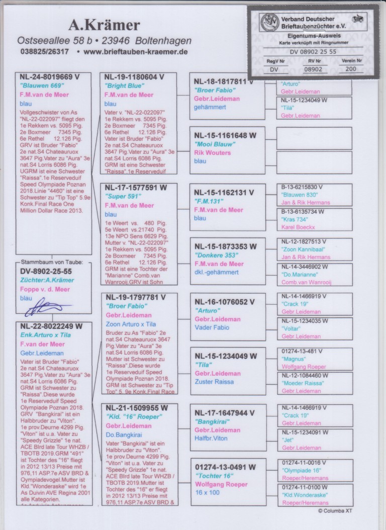 Uit: ”Blauwen 669”, broer 1.-5.095 d., 2.-7.345 d., uit klz. ”Arturo” & ”Tila” x ”Enk. Arturo x Tila”, uit broer ”Fabio”, 2. Nat. Chateauroux 3.647 d. & zoon ”Arturo” & ”Tila”, uit kld. ”Crack 19”, vader ”Arturo”, Stamvader Leideman