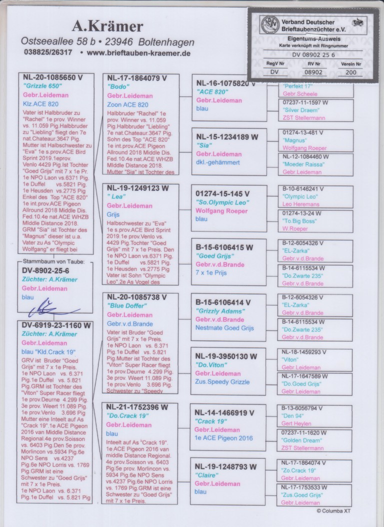 Uit: ”Grizzle 650”, uit dochter ”Goed Grijs”, 7x 1. Prijs & 1. NPO Laon 6.371 d., nazaten winnen 6x 1. Nat. Asduif x ”De 1160”, uit dtr. ”Crack 19”, uit zoon ”Grizli Adams”, nestbroer ”Goed Grijs”, 7x 1. Prijs & 1. NPO Laon 6.371 d.