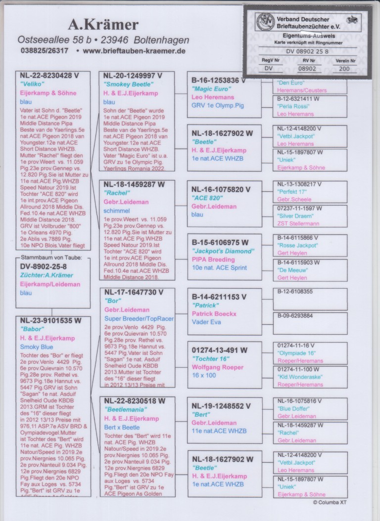 Uit: ”Veliko”, zoon ”Rachel”, 1. Prov. Weert 11.059 d. & 1/2 zus ”Grizzle Mama”, verkocht voor 282.000 euro x ”Babor”, dochter ”Bor”, Superkweker & 1/2 broer ”Eva”, 4. Nat. Asduif, uit dochter ”Beetle”, 1. Nat. Asduif WHZB