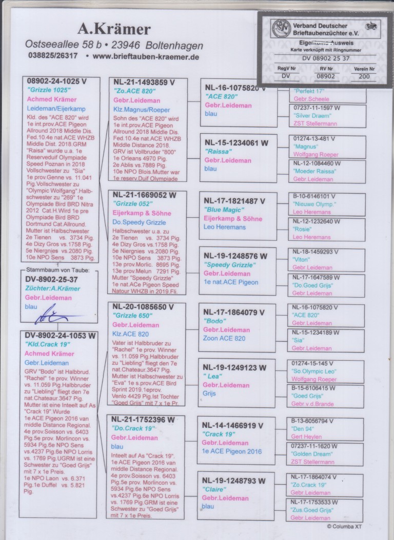 Uit: ”Grizzle 1025”, uit dochter ”Speedy Grizzle”, 1. Nat. Asduif Sprint WHZB, uit zoon ”Ace 820”, gr-vader ”Grizzle Best Kittel”, 2. Nat. Asduif Sprint KBDB x ”Kld Crack 19”, inteelt ”Goed Grijs”, 7x 1. Prijs & 1. NPO Laon 6.371 d.