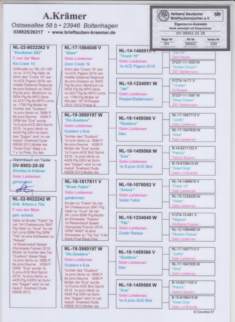 Uit: ”Donkeren 252”, zoon ”Eva-Lotta”, gr-moeder ”Olympic Femke”, 1. Int. Asduif Midfond FCI, 1. Olympiade duif Cat. Jaarlingen x ”Enk. Arturo x Tila”, dochter ”Eva-Lotta”, gr-moeder 1. Olympiade, 1. Int. Asduif Midfond FCI