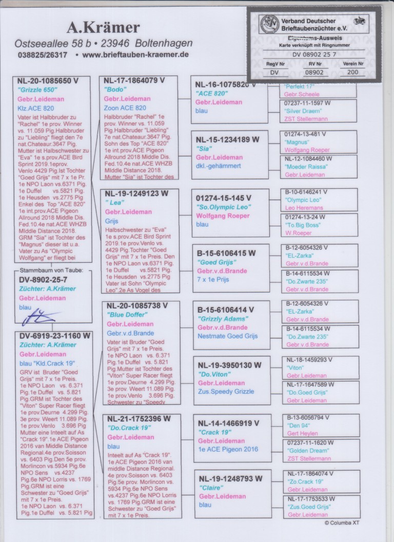Uit: ”Grizzle 650”, uit dochter ”Goed Grijs”, 7x 1. Prijs & 1. NPO Laon 6.371 d., nazaten winnen 6x 1. Nat. Asduif x ”De 1160”, uit dtr. ”Crack 19”, uit zoon ”Grizli Adams”, nestbroer ”Goed Grijs”, 7x 1. Prijs & 1. NPO Laon 6.371 d.