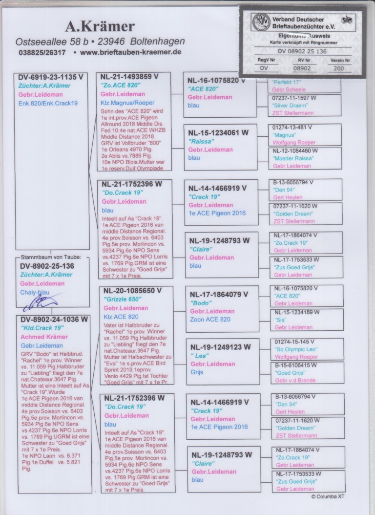 Uit: ”De 1135”, uit zoon ”Ace 820”, gr-vader ”Grizzle Best Kittel”, 2. Nat. Asduif Sprint KBDB, uit zoon ”Raissa”, uit dochter ”Crack 19” & ”Claire” x ”Kld. Crack 19”, uit dochter ”Crack 19”, 1. Regionaal Asduif & ”Claire”, 2x 1. Prov.