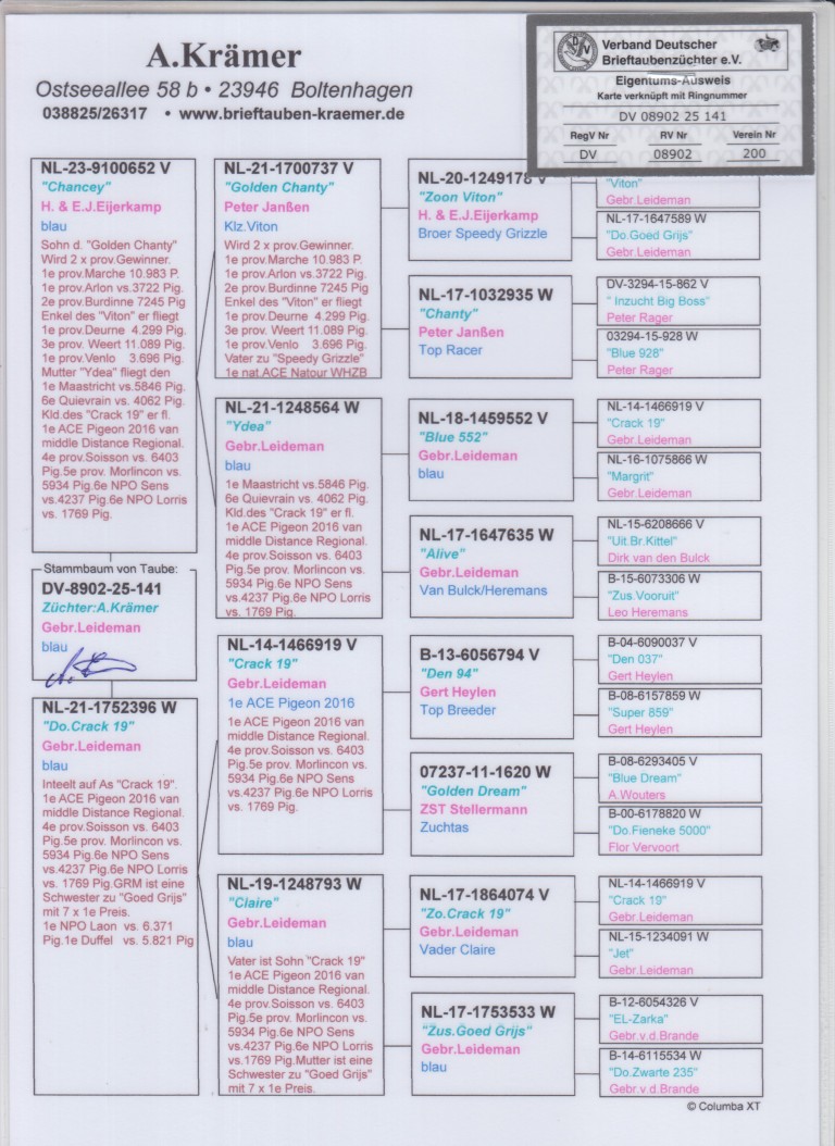 Uit: ”Chancey”, zoon ”Golden Chanty”, 1. Prov. 10.983 d., 1. Prov. 3.722 d., zoon ”Ydea”, 1.-5.846 d., 6.-4.062 d. x ”Dochter Crack 19”, 1/2 zus ”Arturo”, vader ”Fabio”, ”Rosa”, ”Cobalt”, ”Talent”, etc., dtr. ”Crack 19” & ”Claire”