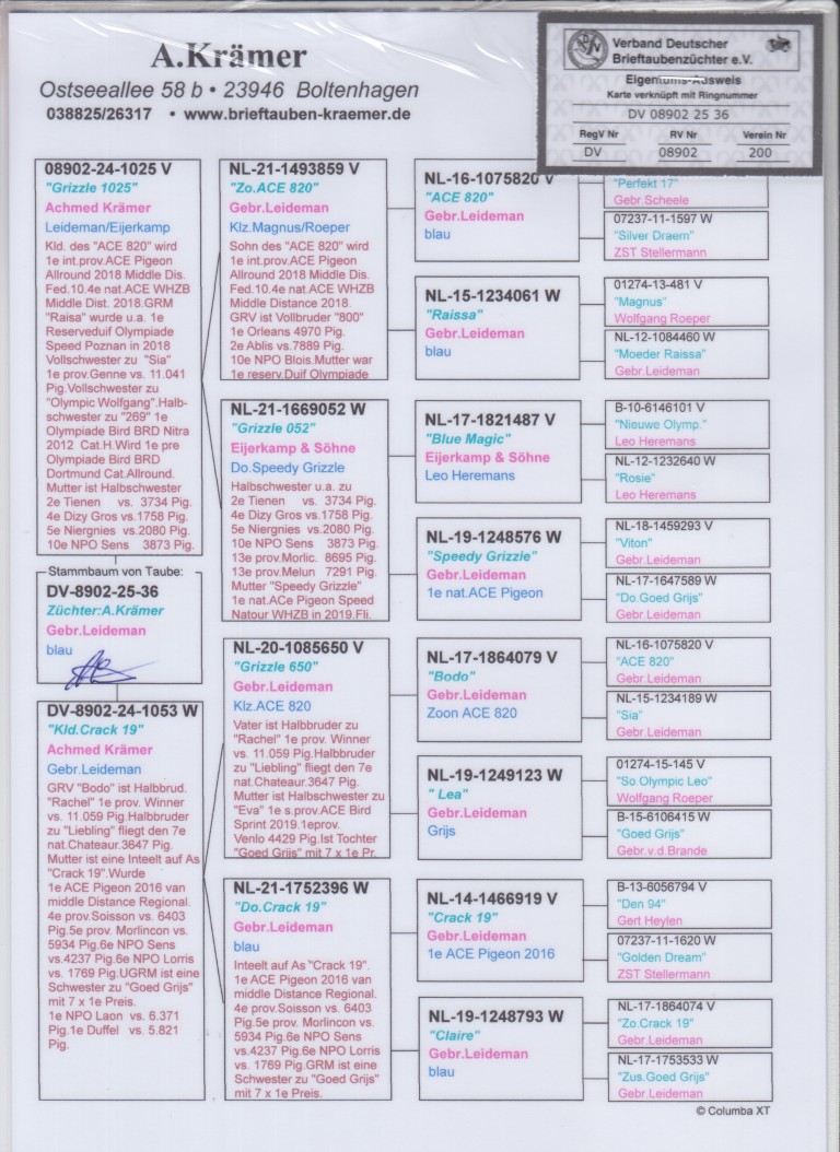 Uit: ”Grizzle 1025”, uit dochter ”Speedy Grizzle”, 1. Nat. Asduif Sprint WHZB, uit zoon ”Ace 820”, gr-vader ”Grizzle Best Kittel”, 2. Nat. Asduif Sprint KBDB x ”Kld Crack 19”, inteelt ”Goed Grijs”, 7x 1. Prijs & 1. NPO Laon 6.371 d.