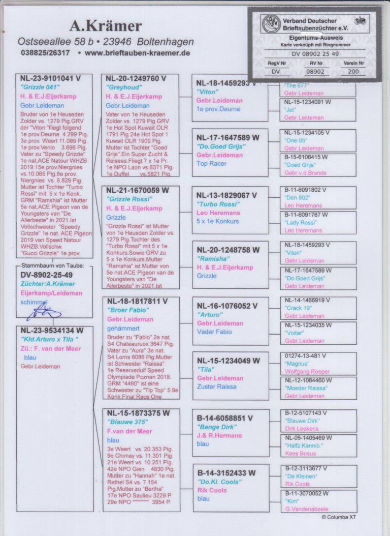Grootvader : NL20-1249760. “Greyhoud” H. & E.J. Eijerkamp.