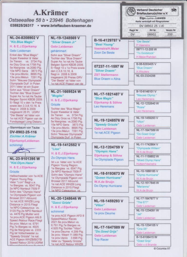 Uit: ”Klz. Blue Magic”, 1/2 broer ”Olympic Amber”, Olympiade duif 2026, uit dochter ”Speedy Grizzle”, 1. Nat. Asduif Sprint WHZB x ”Kld. Olympic Hans”, dochter ”Gucci Grizzle”, 1. Prov. Asduif Sprint & kld. ”Goed Grijs”