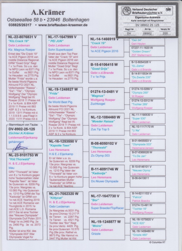 Uit: ”Klz. Crack 19”, zoon ”Pei Jun”, Superzoon ”Goed Grijs”, 7x 1. Prijs & 1. NPO Laon 6.371 d., zoon ”Frida”, 6. Nat. Asduif Allround FCI x ”Kld. Thorwald”, uit dochter Superkweker ”Bor”, 1/2 broer ”Eva”, 4. Nat. Asduif Sprint NPO