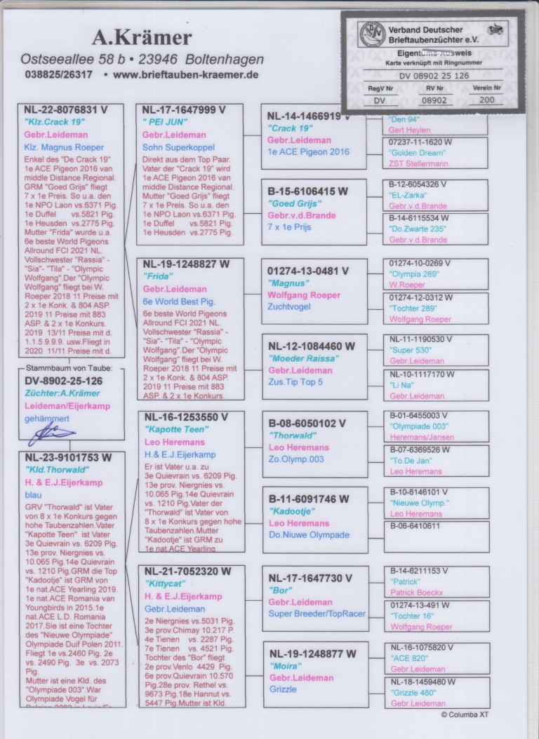 Uit: ”Klz. Crack 19”, zoon ”Pei Jun”, Superzoon ”Goed Grijs”, 7x 1. Prijs & 1. NPO Laon 6.371 d., zoon ”Frida”, 6. Nat. Asduif Allround FCI x ”Kld. Thorwald”, uit dochter Superkweker ”Bor”, 1/2 broer ”Eva”, 4. Nat. Asduif Sprint NPO