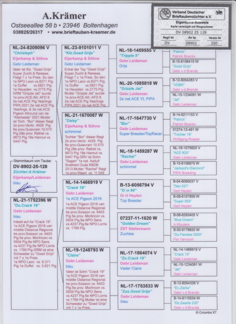 Uit: ”Christoph”, uit klz. ”Goed Grijs”, 7x 1. Prijs & 1. NPO Laon 6.371 d., uit dochter Superkwekers ”Bor” & ”Rachel” x ”Dochter Crack 19”, uit dochter ”Crack 19”, 1. Regionaal Asduif Midfond, dochter ”Claire”, 2x 1. Prov.