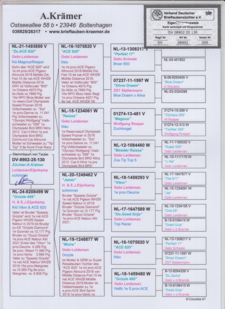 Uit: ”Zoon Ace 820”, zoon ”Ace 820”, 1. Inter-Prov. Asduif, 4. Nat. Asduif, zoon ”Raissa”, 1. Reserve Olympiade x ”Grizzle 499”, inteelt ”Goed Grijs”, 7x 1. Prijs & 1. NPO Laon 6.371 d., nazaten winnen 6x 1. Nat. Asduif