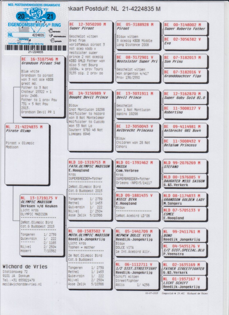 Kweek uit Wereld bekend “Piraat” 3. Nat. As-duif KBDB X